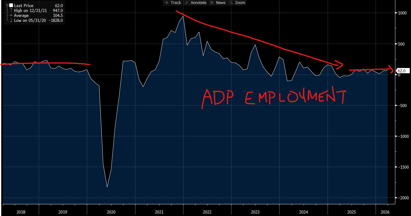 This chart shows the monthly ADP figure, and I purposely widened out the view so you could see where it was prior to the pandemic dip then surge. You can clearly see that the monthly adds trended down rather aggressively since 2021 as hiring normalized in the wake of the mass pandemic layoffs. But you should also note that it is now trending sideways hugging the Zero line in a trend that is LOWER than it was pre-pandemic (monthly adds were averaging 150k to 175k then). Dead? No. Healthy? Absolutely not. In a good place? I will let you decide for yourself. Well, ADP is just one data point, there are several others, and of course, the mother of all employment data dumps comes tomorrow.