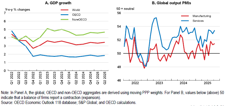 Then we arrive at tariffs again, but this time in a more nuanced form. The OECD is crystal clear that while the eventual impact of the tariff increases will weigh on activity, the early effects have been smaller than almost anyone expected. Why? Because models make assumptions and businesses make choices. Companies have used inventories. They’ve adjusted supply chains. They’ve rerouted trade flows. They’ve taken advantage of new trade agreements that lowered some tariffs even as others went up. The OECD even points out that recent deals with Japan and the EU reduced tariff rates on key categories like cars, parts, and civil aircraft, actually offsetting some of the broader tariff shock. That’s the thing about global economic systems: push here, pull there, and the whole machine tries to find a new equilibrium. It’s messy, but it’s also resilient.