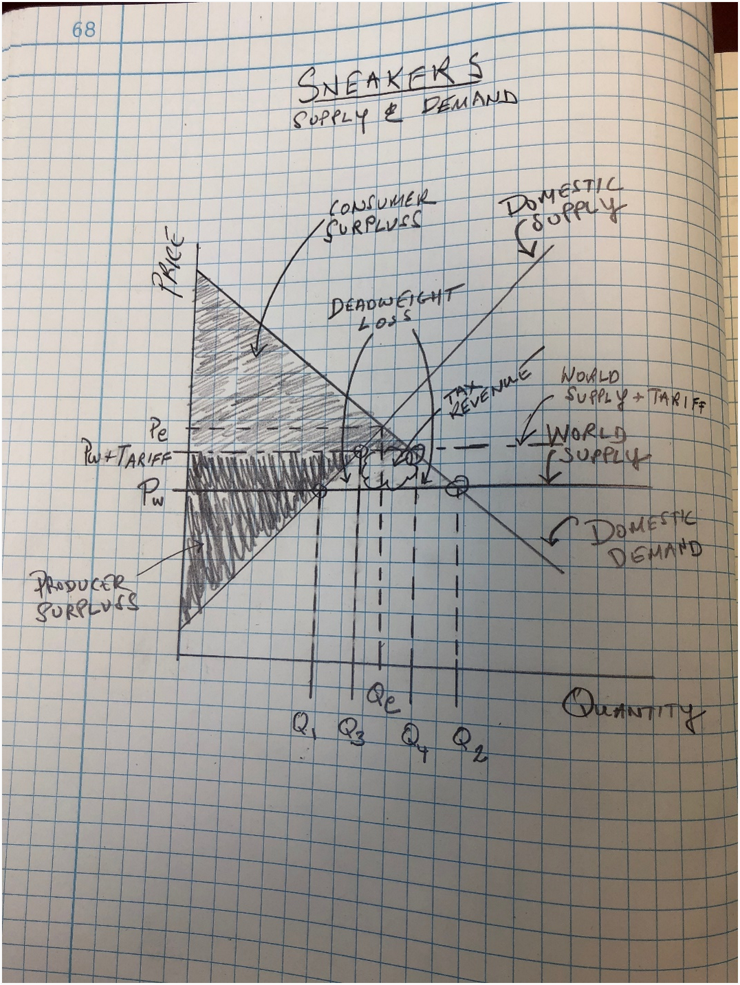 Tariffs distort relative prices and impose a deadweight loss by forcing consumption and production away from their welfare-maximizing, competitive-equilibrium allocations. You know what, I think that I will just show you the drawing I made in my notebook back in 2018 to illustrate tariff impact. Check it out–chuckle a bit and keep reading.