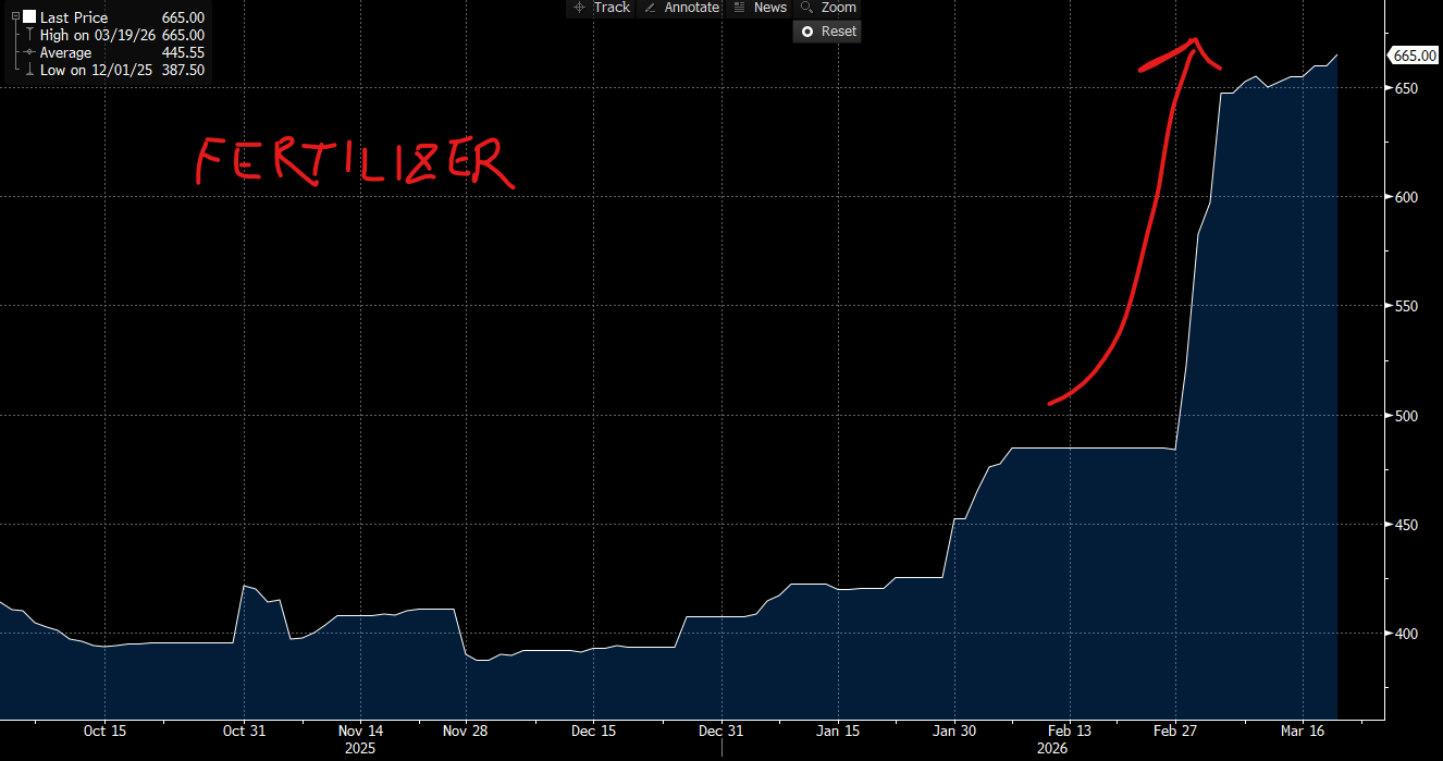 Here is a twist. The fertilizer market is a detail that almost nobody is talking about, and it may end up being the most tangible way this crisis reaches your kitchen table. Roughly one-third of all global fertilizer trade passes through the Strait of Hormuz. Go ahead and read that again! 👈 Urea prices have already jumped from $475 to $680 per metric ton in recent weeks. The spring planting window in the Midwest–the period when American corn and soybean farmers are putting fertilizer into the ground for the harvest that feeds the country–is arriving right now. If those supply disruptions persist through planting season, the downstream effect on food prices will make the current pump price shock look modest by comparison. This is the chain that runs from a drone strike on a Persian Gulf pipeline to the price of your groceries in July. Every link in that chain is now under stress simultaneously.