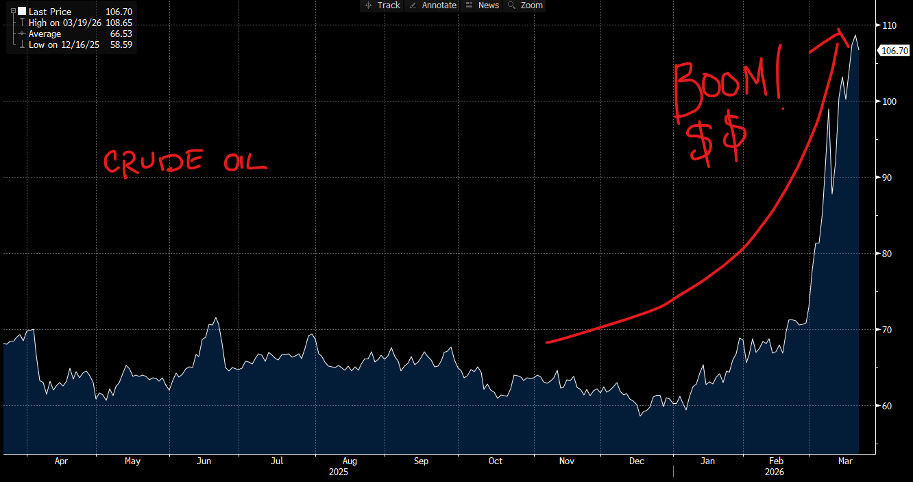 The techno-thriller movie, which starred a young Matthew Broderick, came out in 1983 and struck a nerve that was very much exposed in the zeitgeist of the day. Today–more than 40 years later–a very different nerve is being exposed. Today, you would be hard-pressed to find a single person on the planet that is not afraid of seeing energy prices spike higher! 😰 And that is precisely what we are witnessing RIGHT NOW. This morning, Brent Crude is $108 a barrel! That is up by almost 80% year to date, the bulk of those gains being added in the past few weeks in response to the Iran conflict. Those gains already have had–and will continue to have–impacts on everyone–everywhere!
