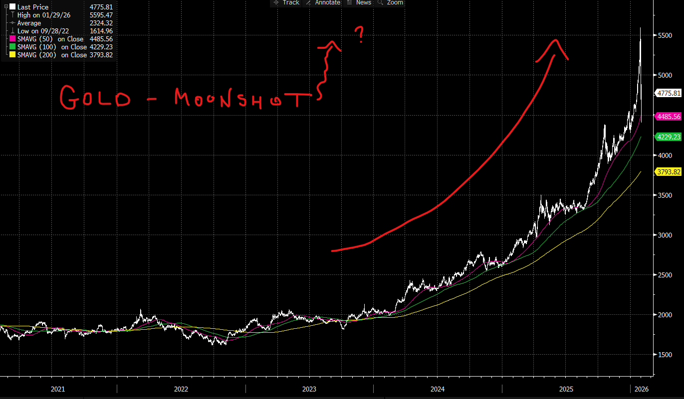 You probably don’t have to squint too hard to recognize that this is a time series bar chart of Spot Gold. How do you know? Well, how about its parabolic growth since 2024–that’s how. Actually, I use the term parabolic liberally, in a mathematical sense. There are some periods in which the metal grew geometrically, but we often use the term–on Wall Street at least–to describe something that gained a lot in a short period of time. In fact, the term is often used to describe growth with an implication that the growth is unsustainable or unrealistic. This goes hand-in-hand with the saying imprinted in my trusty, old Wall Street Sayings notebook that goes something like: “if it seems to be too good to be true, it isn’t.” I think that is on one of the first few pages, and indicator of how important it is.