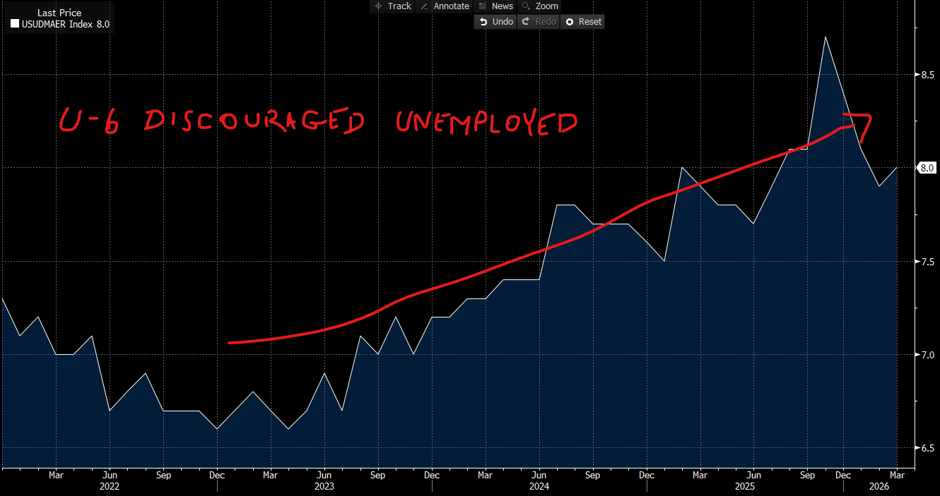 Speaking of discouraged workers, the BLS reported that this group jumped by 144,000 in a single month to 510,000 in March. The number of people marginally attached to the labor force (those who want work, have looked for it in the past year, but have simply stopped trying) increased by 325,000 to 1.9 million. Then there is the 6.0 million Americans who are not in the labor force at all but say they currently want a job. None of these people show up in the headline unemployment rate. None of them generate political alarm the way a rising U-3 does. But they absolutely represent real human beings who are not participating in the economy the way my two famous quotes from above ☝️🙃 require for a growing economy. These folks are neither employed nor confident.