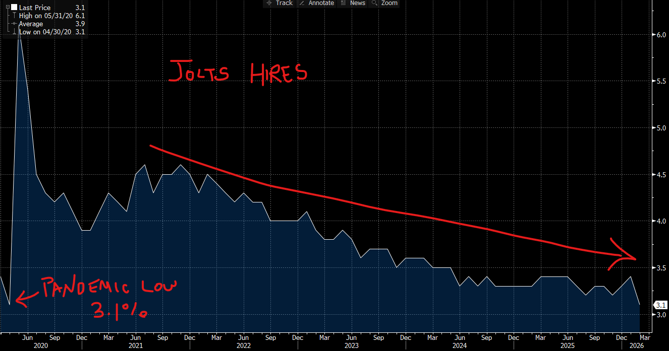 And then there is the JOLTS data, which arrived last week just days before the March employment report and which, in my view, tells the most honest story of all about the actual state of hiring demand in this country. The February Job Openings and Labor Turnover Survey (JOLTS) showed that the hires rate fell to 3.1%, matching the lowest reading recorded since April 2020, when the economy was physically shuttered during the pandemic. Total hires dropped to 4.8 million, and job openings held at 6.9 million. Let me put that hires rate in context for you. In April 2020, businesses were locked. Nobody was going anywhere. Nobody was hiring because nobody was open. Today, restaurants are full, office buildings are occupied, and yet employers are still barely bringing anyone on board. That is not a healthy labor market in disguise. That is a labor market where risk aversion has set in so deeply that businesses would rather run lean than commit to new headcount. The “quits” rate–historically one of the best real-time measures of worker confidence, because people quit when they believe better opportunities exist–held at just 1.9%, also near multi-year lows. Workers do not quit when they are nervous. And right now…er, they are nervous.