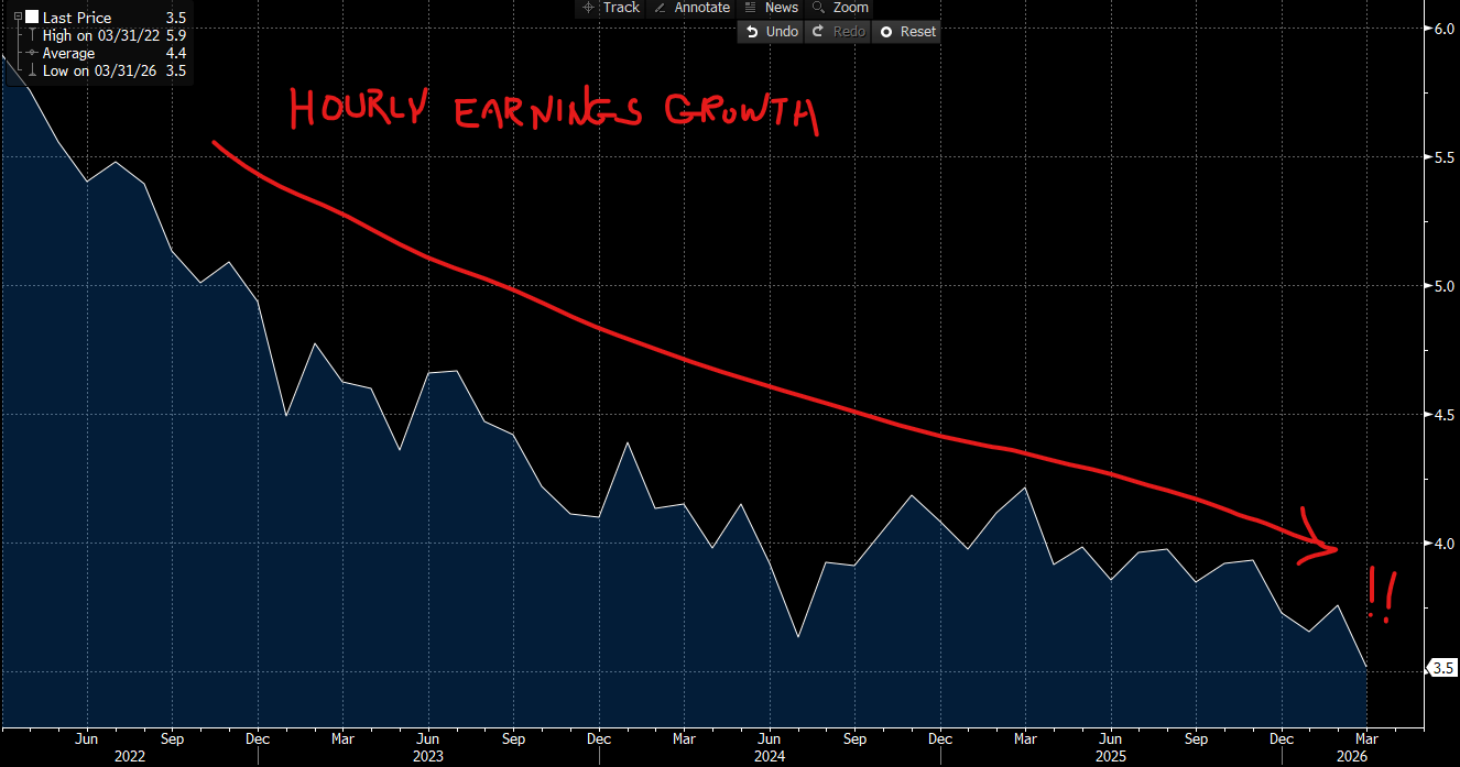 What all of this does, unfortunately, is give the Federal Reserve hawks exactly the permission slip they were looking for to stay on hold indefinitely. Wage growth came in at 0.2% for the month and 3.5% year-over-year, with average hourly earnings rising to $37.38, according to the BLS establishment survey data. The annual wage growth pace of 3.5% is the lowest since May 2021, and it came in below the consensus expectation of 3.7%. THIS IS IMPORTANT: the inflation picture from wages is moving in the right direction for the inflation hawks; wage growth is a primary catalyst for the most dangerous inflation, demand-pull inflation.